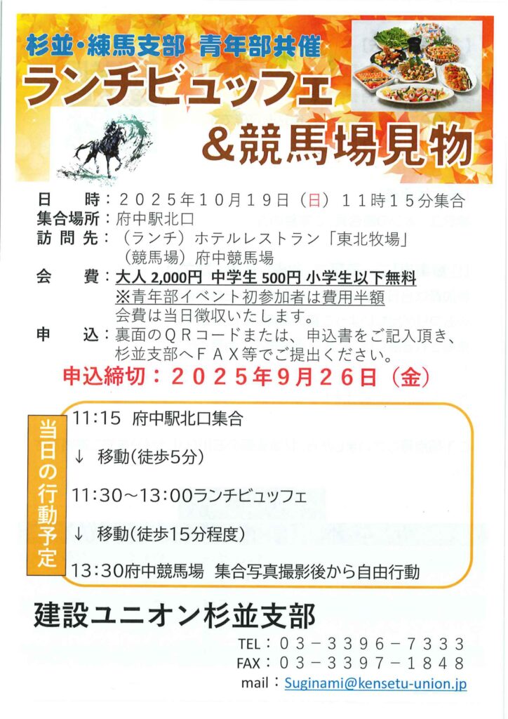 10月19日(日)に杉並・練馬支部合同で、ランチビュッフェ&競馬場見物を開催いたします。